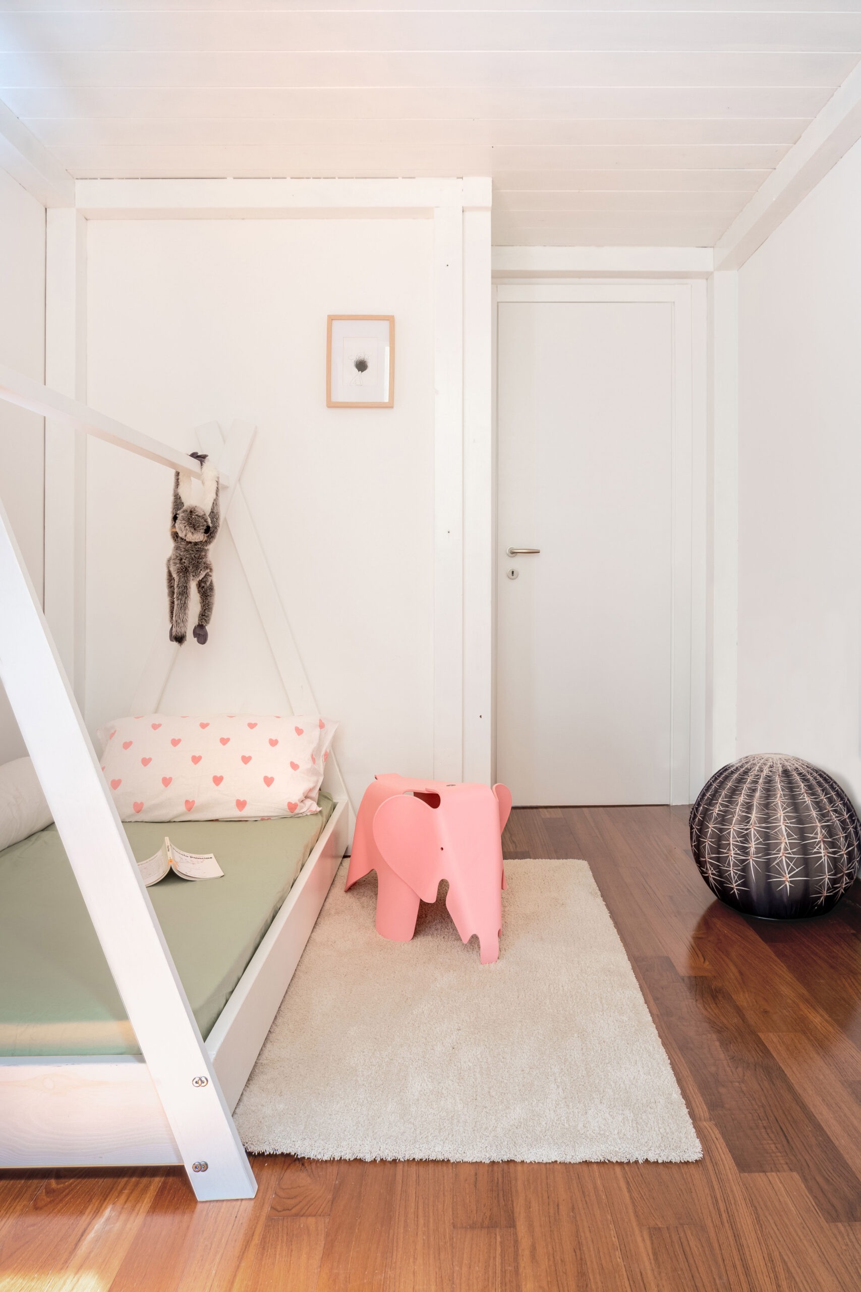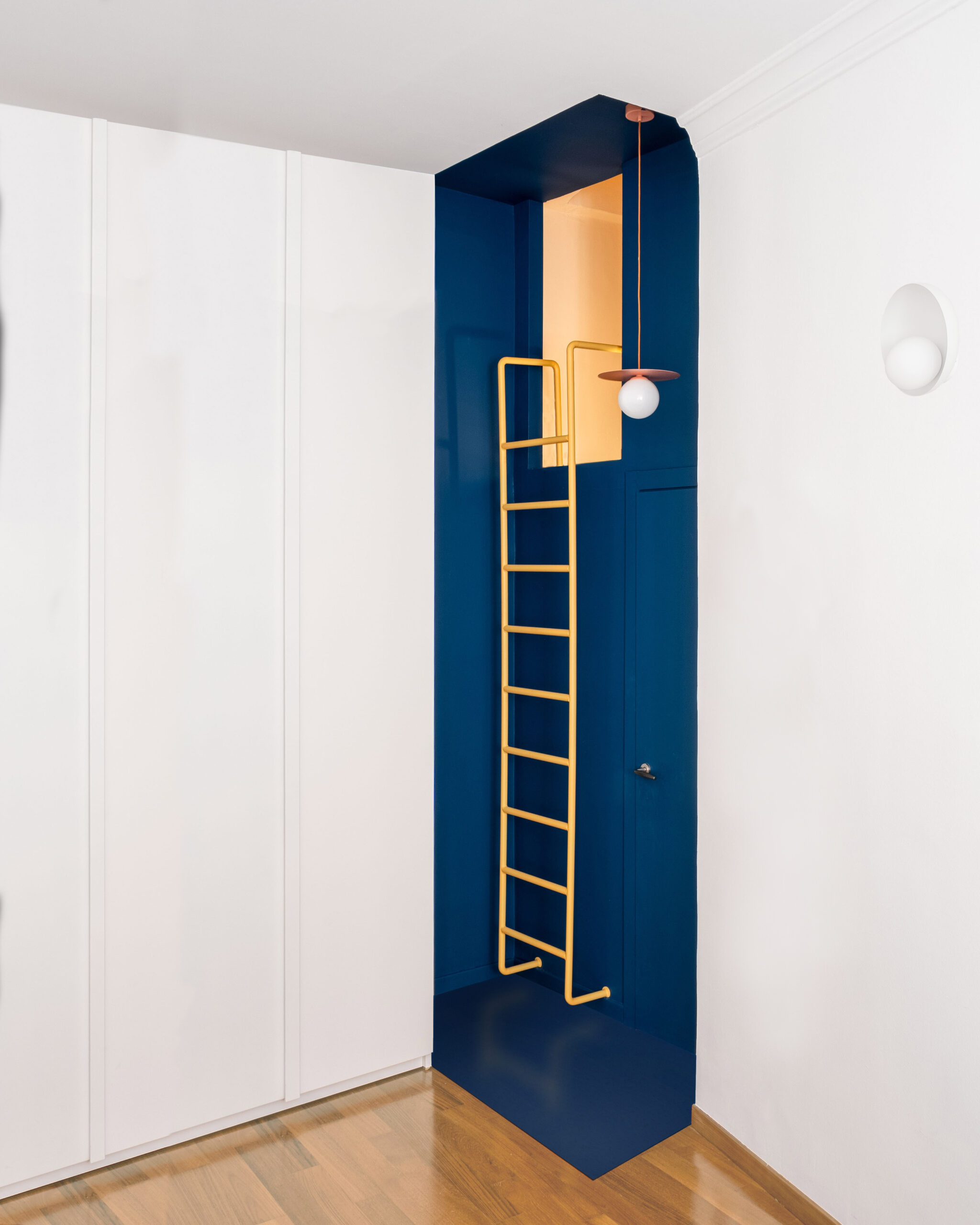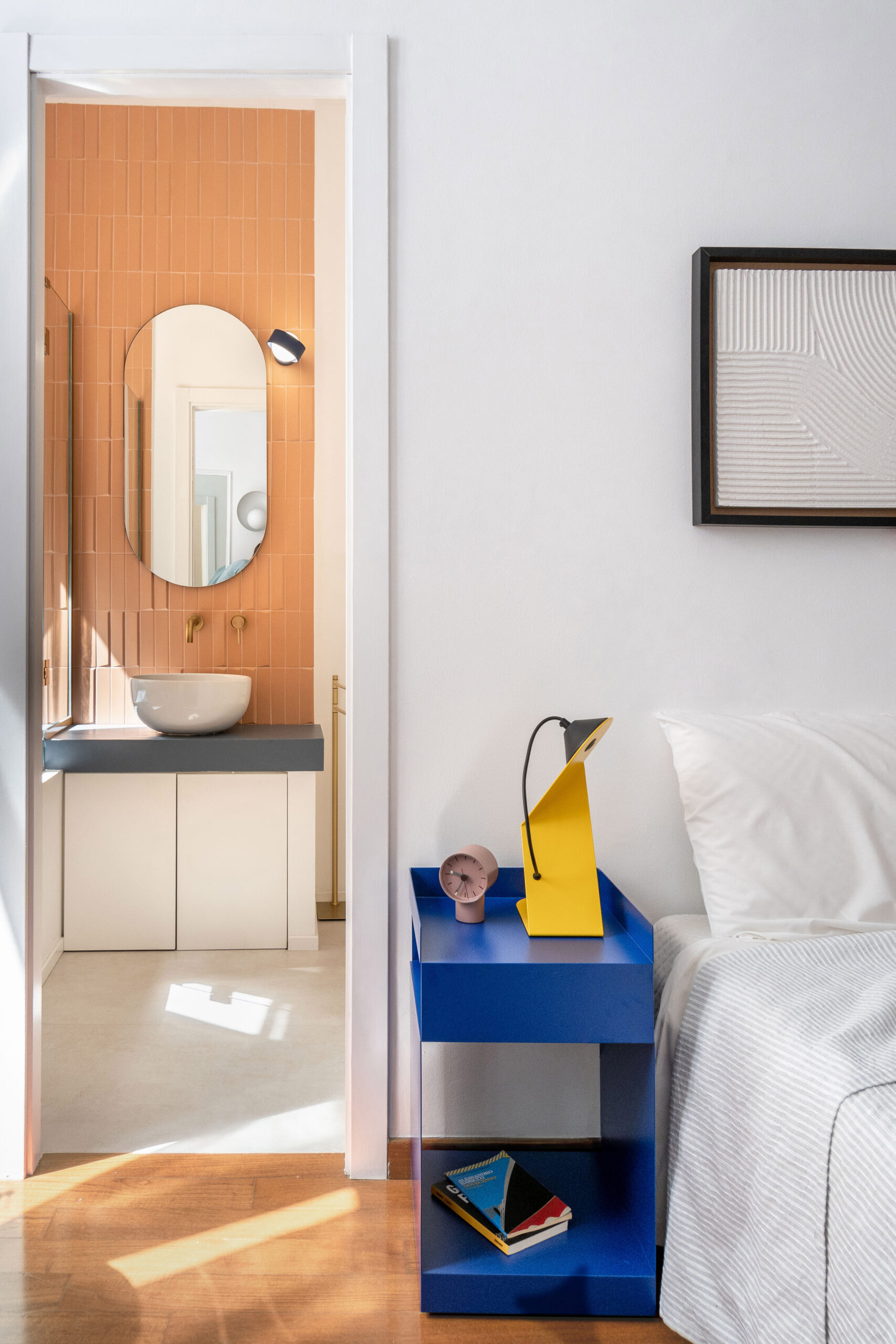 Nella zona notte, la più intima e privata, troviamo due camere da letto e due servizi igienici. Un angolo della camera matrimoniale è scavato dal blu notte che disegna un’insenatura a doppio livello dedicata alla cabina armadio. All’interno di questa insenatura compaiono ambienti color corallo, il cui tono caldo si riverbera all’esterno attraverso la scaletta metallica e la lampada a sospensione. L’utilizzo di due colori complementari definisce le geometrie delimitando un dentro ed un fuori, un guscio ed un nucleo, tipica conformazione dei molluschi marini. Nel bagno padronale si intreccia un dialogo armonico tra matericità e cromie: le piastrelle rosa tridimensionali rivestono le superfici verticali e accompagnano lo sguardo dall’area vasca fino al lavabo. Una mensola monolitica azzurra attraversa il vetro della zona vasca, trasformandosi all’interno del box in un piano d’appoggio continuo e funzionale. La cameretta della bambina è caratterizzata da una palette di colori delicati e avvolgenti. L’ispirazione marina riaffiora nei dettagli, ma si esprime in modo più deciso nel soppalco in legno verniciato di bianco che richiama gli interni di una piccola imbarcazione, evocando un’idea di gioco, rifugio e avventura. Zara1 racconta un viaggio continuo, un progetto che restituisce uno spazio autentico. Ogni arredo e ogni dettaglio narrano un contrasto come tappe di un viaggio: dal vintage al moderno, dal lussuoso al più essenziale in un equilibrio che rende la casa unica e personale.