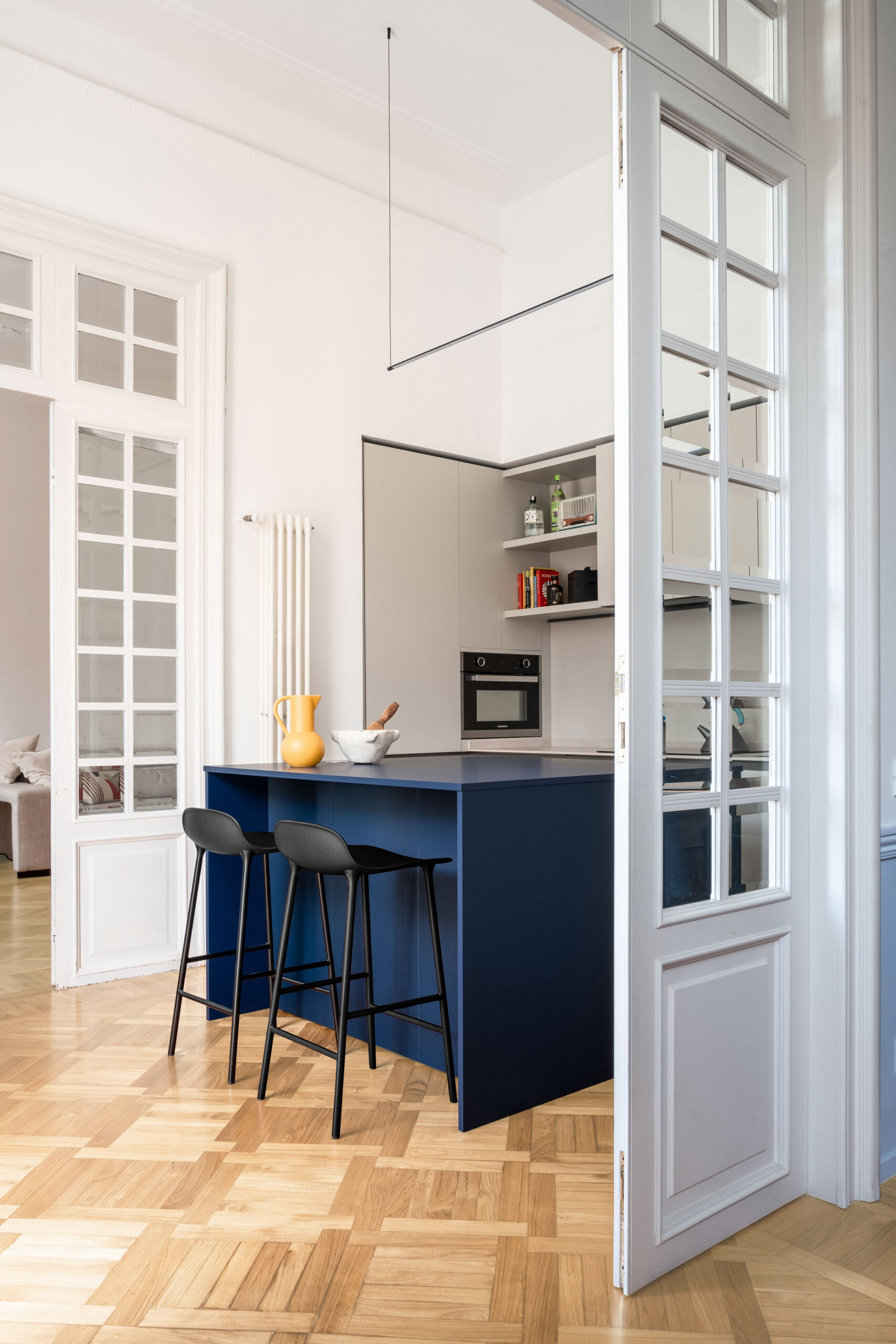 “La casa custodiva già un fascino nobile, ma il progetto ne ha svelato la vera anima: il nastro azzurro che corre tra gli ambienti dialoga con il parquet antico, esaltandone la bellezza e creando continuità”