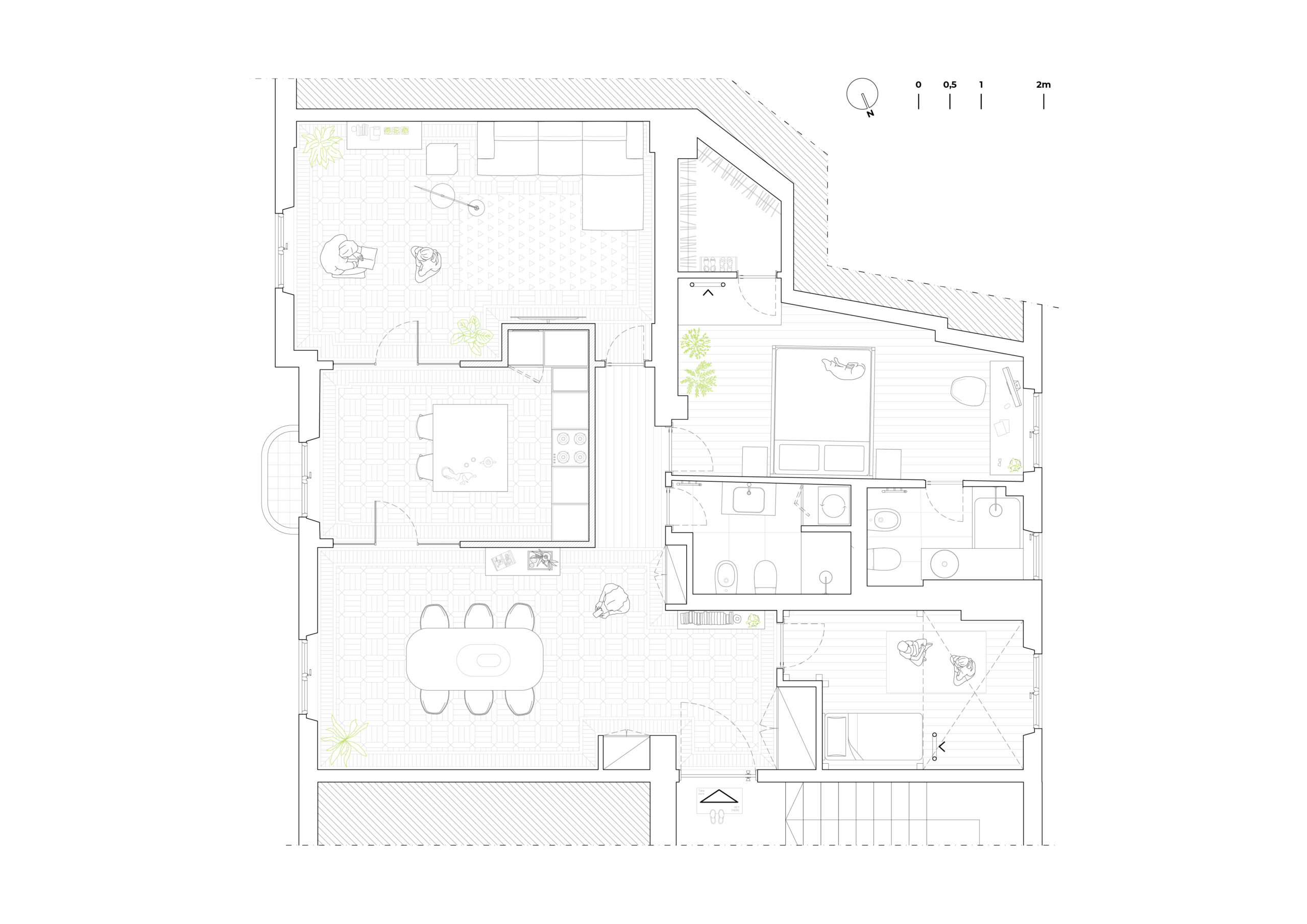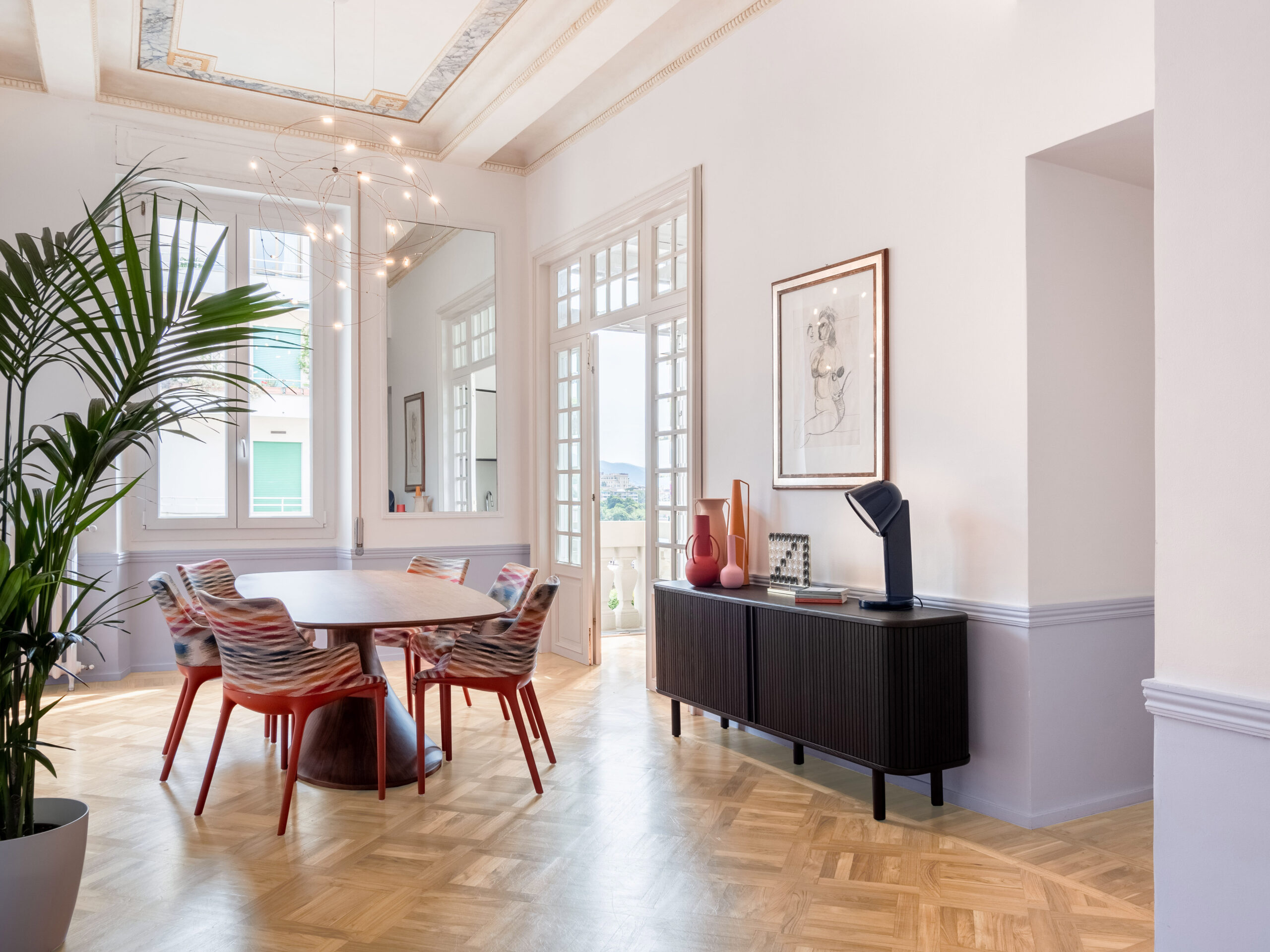 La sala da pranzo e il soggiorno dialogano con la cucina centrale, vero cuore pulsante della casa. La posizione della cucina è accentuata dalla presenza di un oggetto che la definisce come il baricentro della zona living: un’isola di forma insolitamente quadrata di un intenso blu marino. Le due grandi porte vetrate, poste una di fronte all’altra, incorniciano giochi di luce e prospettive inedite e collegano questi ambienti, amplificandone la profondità spaziale. I pavimenti in parquet d’epoca, con le loro venature e i loro schemi geometrici, sono stati mantenuti conferendo all’abitazione un carattere senza tempo dal passato nobile e ricco, che dialoga costantemente con il linguaggio contemporaneo di molti degli elementi presenti. Nella sala da pranzo, il soffitto affrescato sovrasta un grosso tavolo scultoreo in legno e domina la scena catturando lo sguardo non appena varcata la soglia di Zara1. Il salotto invece, è caratterizzato da un volume rosso che dona maggior tridimensionalità alla stanza fungendo da parete TV e da portale di passaggio verso gli spazi distributivi. La luce gioca un ruolo fondamentale nella percezione dello spazio: i soffitti decorati, sono enfatizzati da un’illuminazione radente perimetrale, che ne esalta la profondità con un effetto morbido e avvolgente.